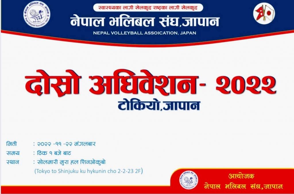 नेपाल भलिबल संघ जापान शाखाको दोस्रो अधिवेशन नोभेम्बर २२ तारिक मंगलवार हुने भएको छ।