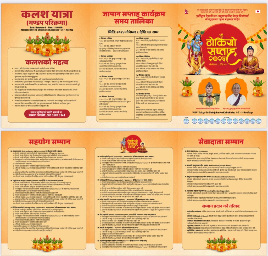 जापानका सम्पूर्ण नेपालीको आस्थाको धरोहरका रुपमा विकसित हुने गरी निर्माण गरिन लागेको नेपाली घर निर्माण जस्तो पवित्र उद्देश्य राखी आयोजित यस टोकियो सप्ताहमा जापानवासी नेपाली दाजुभाइ तथा दिदीबहिनीहरुले समेत अपनत्व रहने साथै धार्मिक हिसाबले समेत पुण्य लाभ हुने यस महान् कार्यको लागि आर्थिक सहयोग अर्थात् महायज्ञका लागि दान गरिदिनु भै पुण्य आर्जन गर्नु हुनका लागि नि वर्तमान एनआरएनए जापानका अध्यक्ष तथा यस परियोजनाका परिकल्पनाकार नवीन निउरेले अनुरोध गरेका छन्।