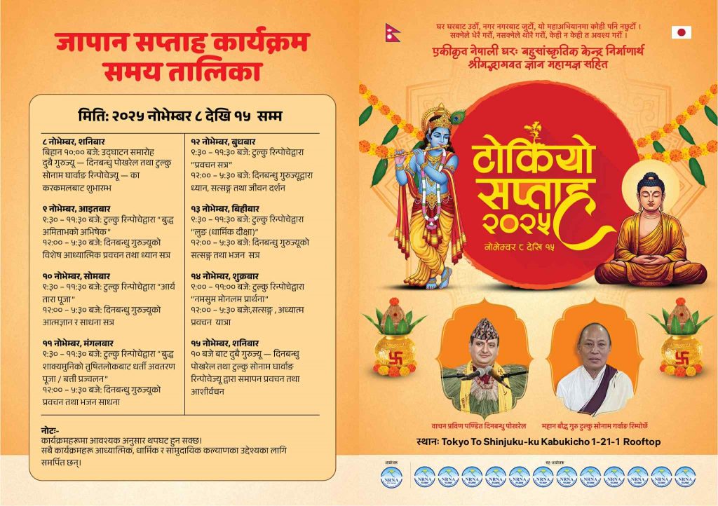 नोभेम्बर ८ देखि १५ तारिखसम्म सञ्चालन हुने उक्त महायज्ञ ‘टोकियो सप्ताह’ का लागि आवश्यक मण्डव निर्माण, कलश यात्राका लागि आवश्यक कार्य, स्वयम् सेवक परिचालनका साथै यज्ञादीका लागि गरिनु पर्ने सम्पूर्ण तयार पुरा भएको एनआरएनए जापानका अध्यक्ष तथा टोकियो सप्ताह २०२५ मूल आयोजक समितिका संयोजक सुभास लामिछानेले जानकारी दिए।