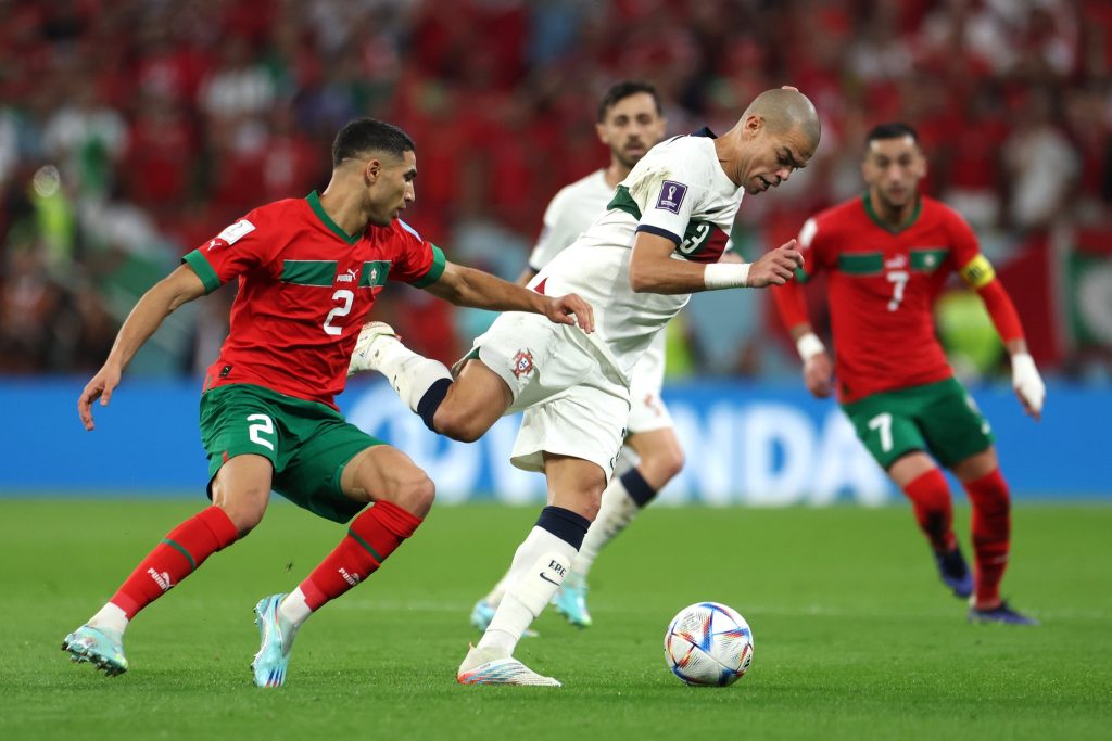 DOHA, QATAR - DECEMBER 10: Pepe of Portugal controls the ball against Achraf Hakimi of Morocco during the FIFA World Cup Qatar 2022 quarter final match between Morocco and Portugal at Al Thumama Stadium on December 10, 2022 in Doha, Qatar. (Photo by Maja Hitij - FIFA/FIFA via Getty Images)