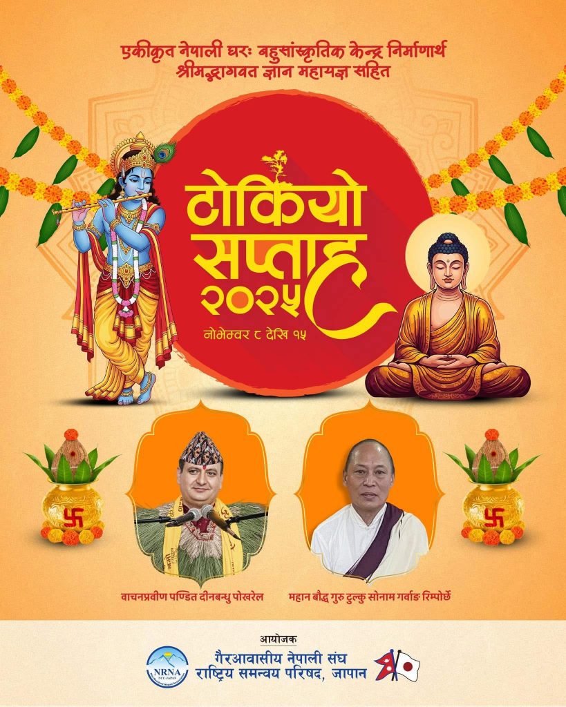 टोकियो – जापानमा एकिकृत नेपाली घरः बहु साँस्कृतिक केन्द्र निर्माणका लागि आर्थिक स्रोत जुटाउन सप्ताहब्यापी श्रीमद्भागवत ज्ञान महायज्ञ हुने भएको छ ।