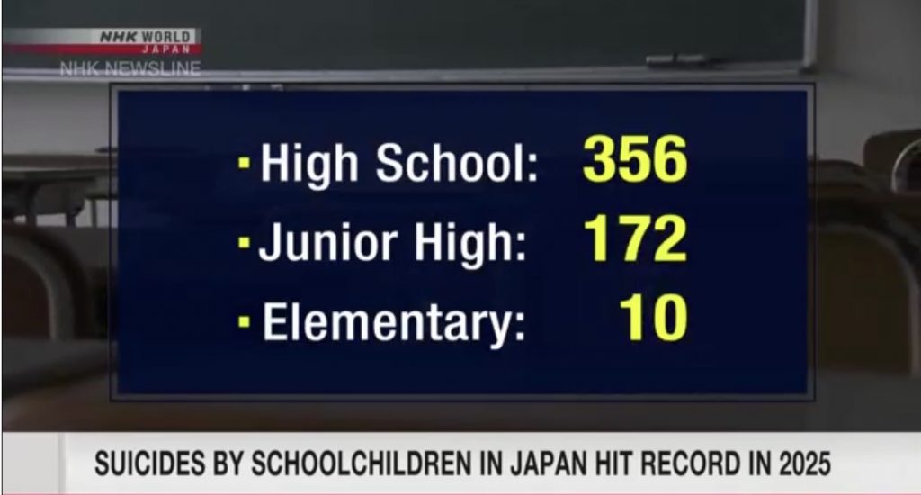 टोकियो, जापान जापानमा गत वर्ष ५३८ विद्यार्थीले आत्महत्या गरी रेकर्ड कायम गर्दा कुल आत्महत्याको संख्या भने घटेर हालसम्मकै न्यून बिन्दुमा झरेको तथ्य सरकारी तथ्याङ्कले सार्वजनिक गरेको छ।