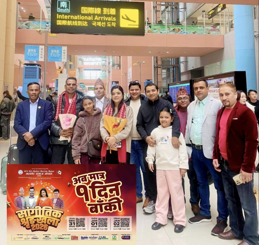 नेपाली सांगीतिक क्षेत्रका चर्चित हस्तीहरू शिव परियार र समीक्षा अधिकारी लगायतका कलाकारहरूको टोली जापानको ओसाका आइपुगेसँगै यहाँको माहोल तातेको हो। गलकोट समाज जापानले अंग्रेजी नयाँ वर्षको अवसर पारेर ओसाका, नागोया र टोकियोमा भव्य ‘सांगीतिक शृङ्खला–२०२६’ आयोजना गर्दैछ।